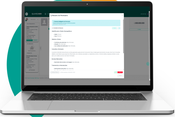 Documente atendimentos, entenda históricos e produza laudos com apoio de IA — tudo dentro do prontuário eletrônico do QuarkClinic.